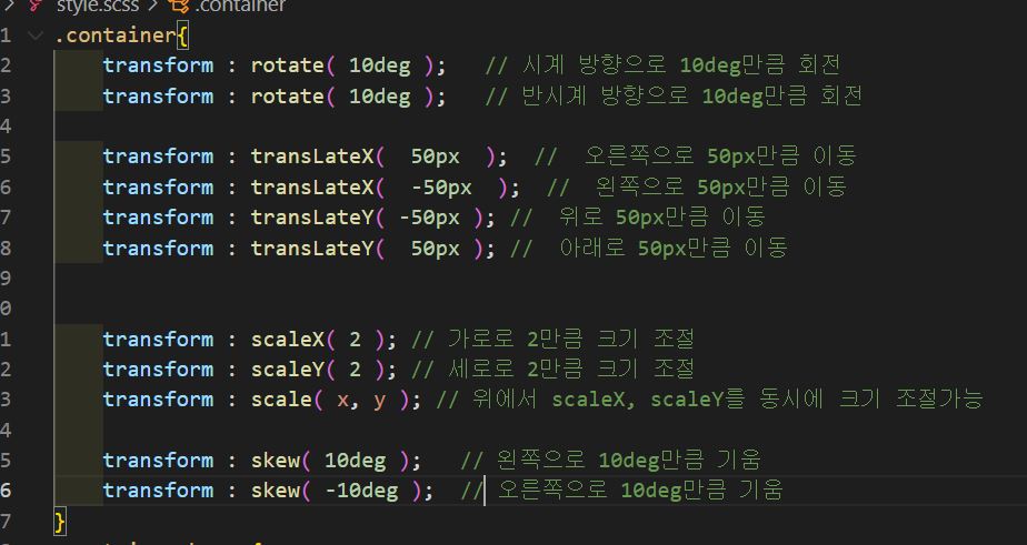 transform : transLateX( 50px ); = 오른쪽으로 50px만큼 이동
