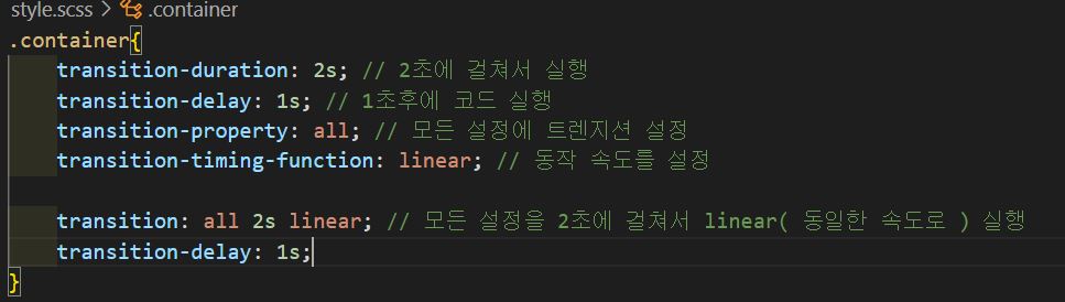 ex): transition: all 2s linear = 모든 설정을 2초에 걸려서 linear 로 실행